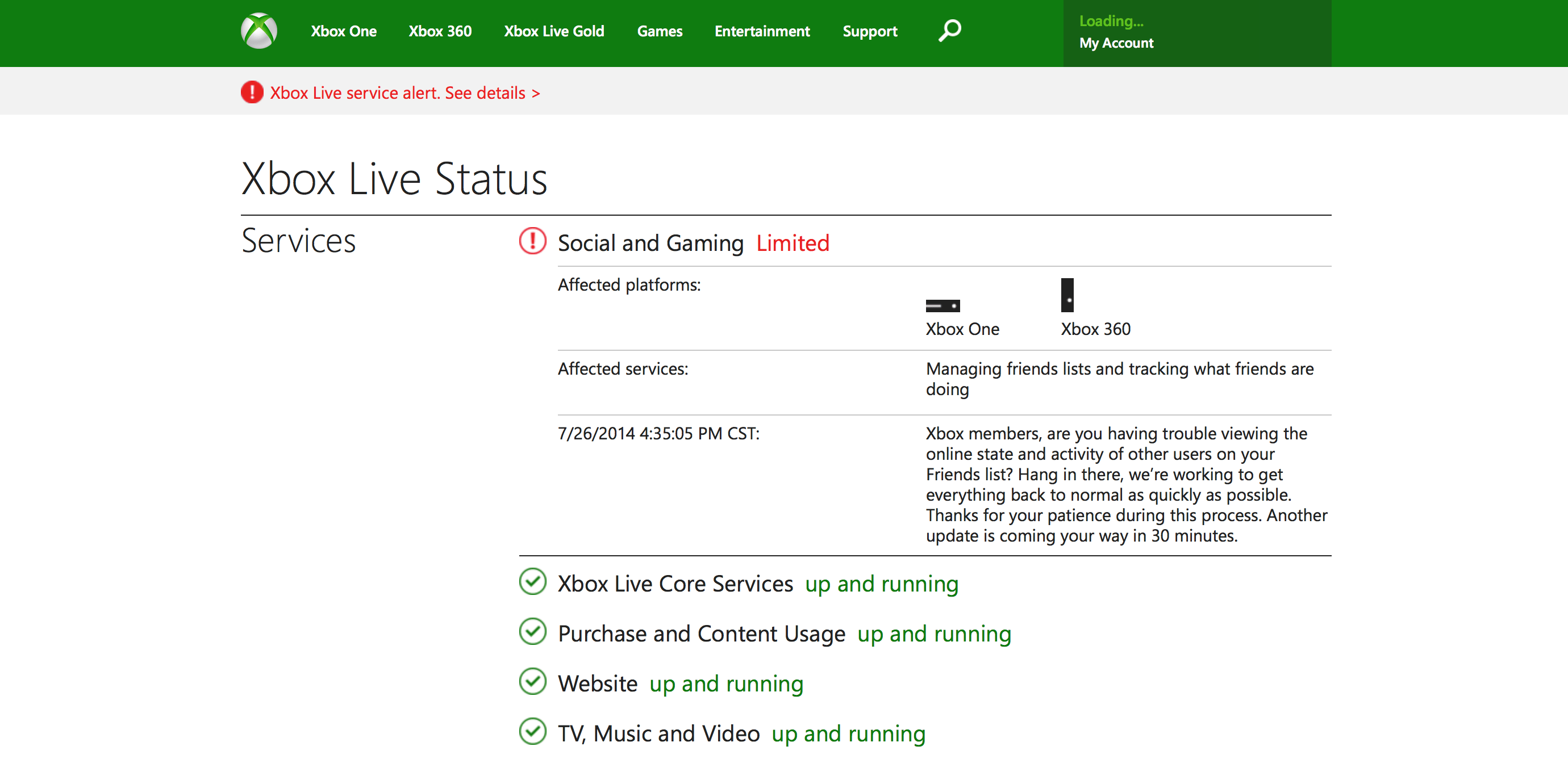 The official Xbox Service page says Social and Gaming are Limited, telling us that “Xbox members, are you having trouble viewing the online state and activity of other users on your Friends list? Hang in there, we’re working to get everything back to normal as quickly as possible. Thanks for your patience during this process. Another update is coming your way in 30 minutes.”