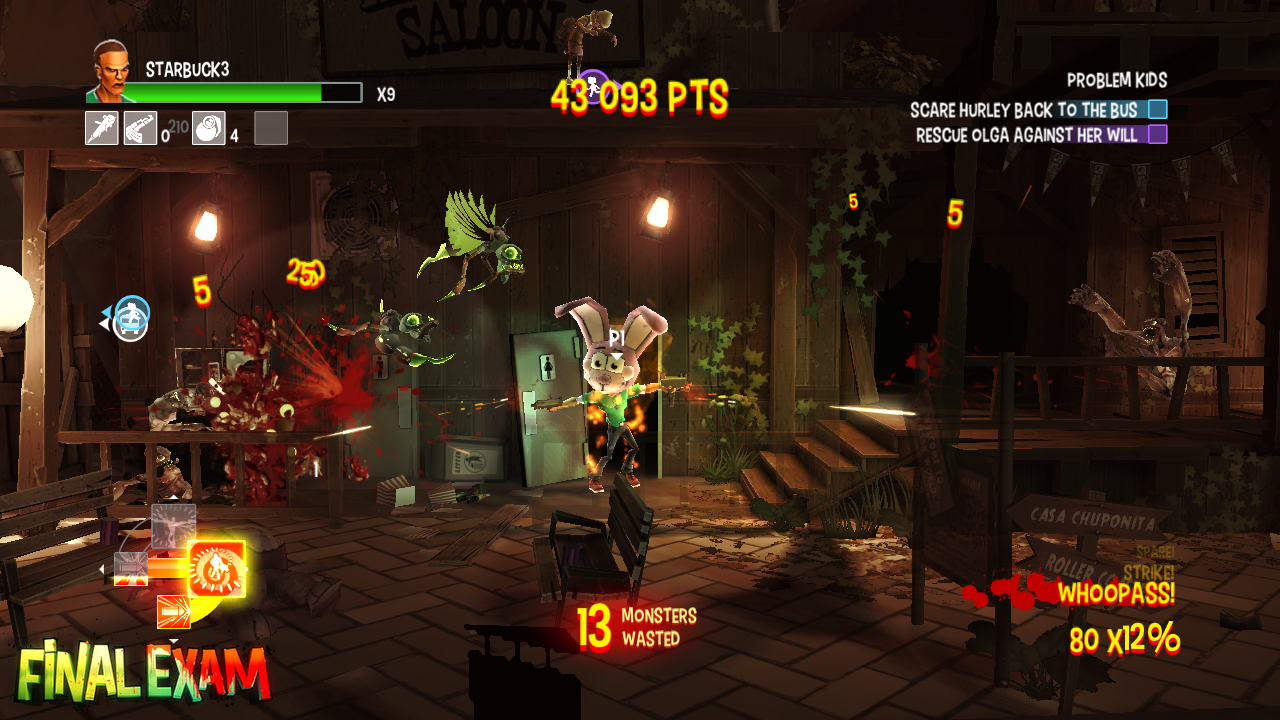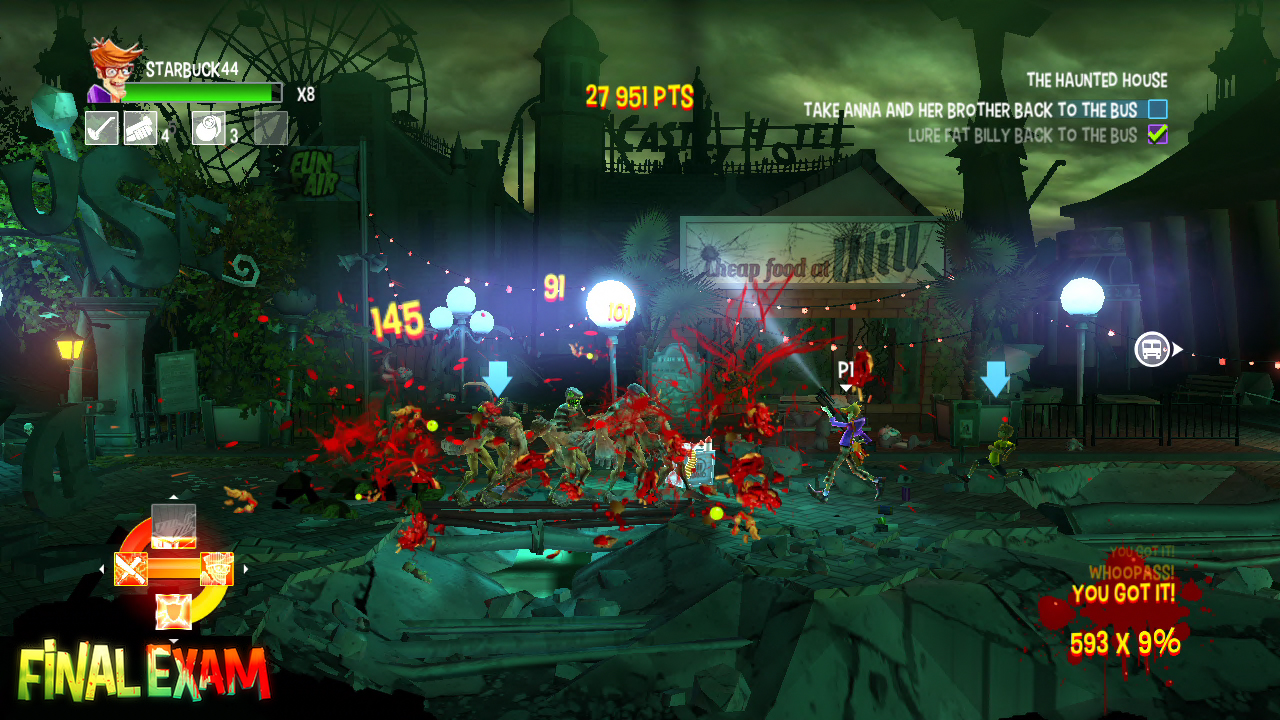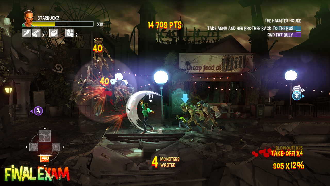 Final Exam (formerly known as Obscure) is an action-packed 2.5D side-scrolling action title that is sure to bring pleasure to gamers and fans of the teen horror genre alike. Featuring online and offline co-op players are cautioned to not take this title lightly. With its cartoon style and goofy characters it may take some by surprise when they find that there are some true survival-horror elements to this game. Limited ammo and health packs, hordes of enemies and plenty of challenge will make this game a nice challenge for even seasoned gamers. Final Exam is all about the combat. This brawler style game focuses on combos, follow-up attacks and multipliers in order to level up characters, unlock new weapons and add devastating new skills and abilities. The non-linear nature of the levels allow for different tactics and strategies when teaming up with friends. You can split up to cover more ground and complete objectives faster or you can go it as a group and try to stay alive as long as possible. Either way you choose to play it will provide a robust experience that will keep you wanting to replay levels and top your high scores.