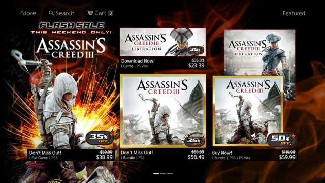 Ubisoft and PSN are teaming up this weekend for a huge sale on everything Assassins Creed. You can buy Assassins Creed 3 for the reduced price of $38.99 , the Gold Edition which includes the full game and a season pass for all forthcoming DLC for $58.49 and can download the PS Vita only title Assassins Creed: Liberation for $23.39. As if that wasn’t enough the Bundle that will include both games can be downloaded for $59.99. This sale is this weekend only and might be the last time you see these brand-new games at price points this low for quite a while.