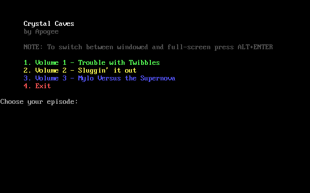 Crystal Caves is another side scrolling shooter in the 3D Realms library, and this one is pretty expansive. The primary goal is to collect crystals, which are scattered throughout the game world within a series of caves. You can complete the caves in any order you choose, but once you enter one you cannot escape until all crystals are collected.