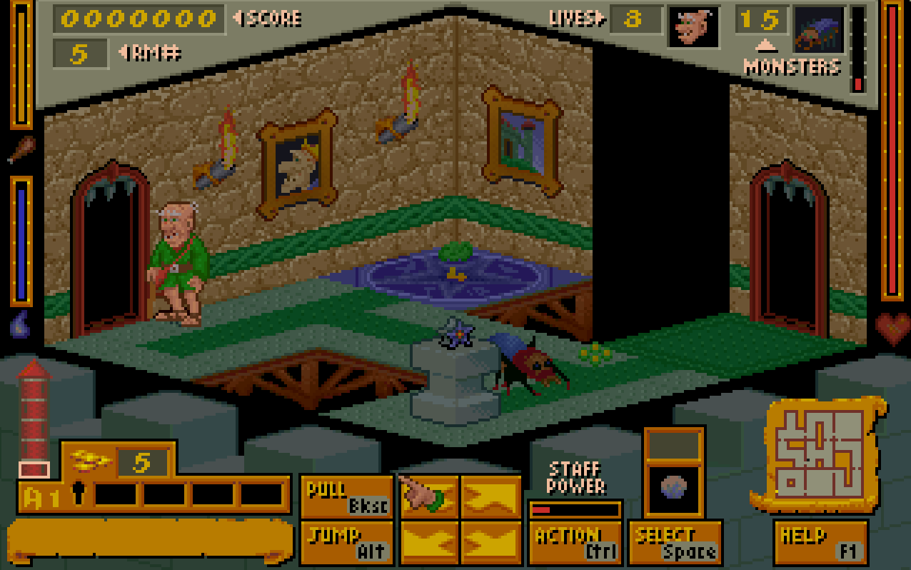 Baldric, despite looking quite old, is surprisingly spry. He can jump, roll, flip and run across the room, and can use magic to teleport, heal, and even levitate. The game has a number of interesting monsters that are not exactly intelligent, but have the ability to follow you from room to room, so don’t take them lightly.
