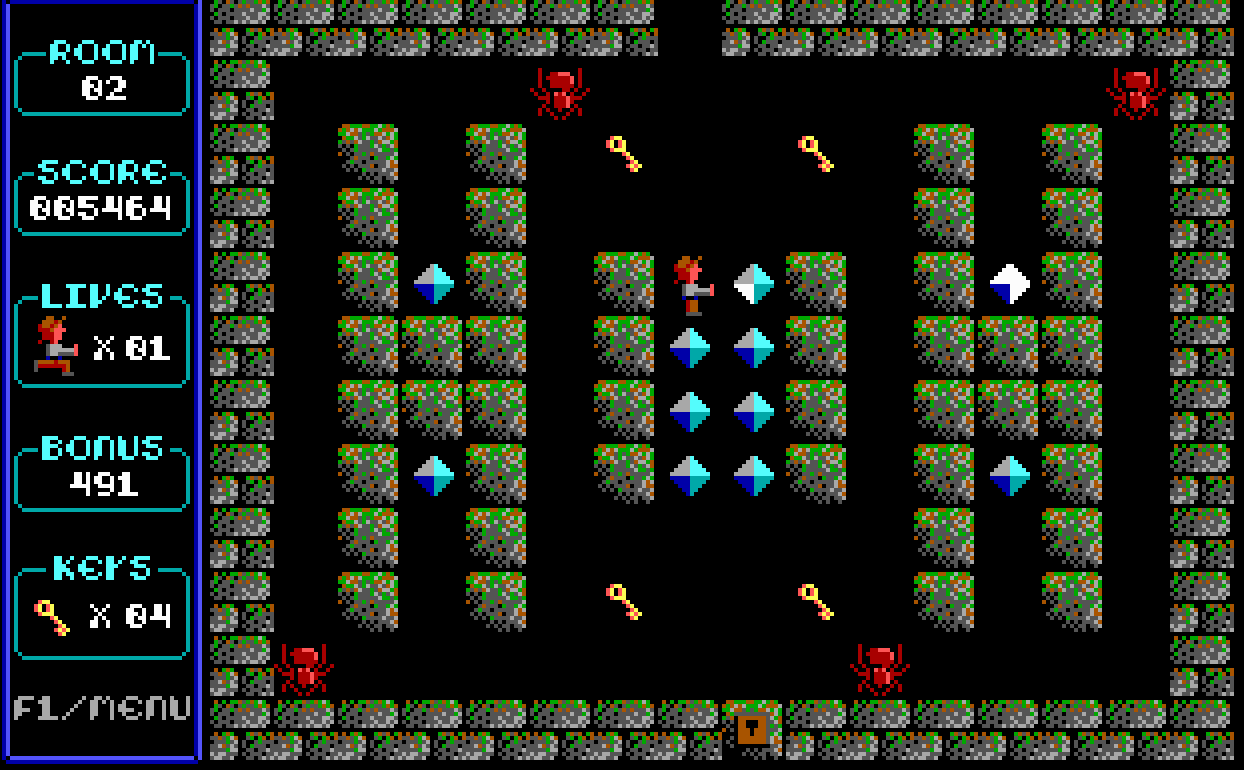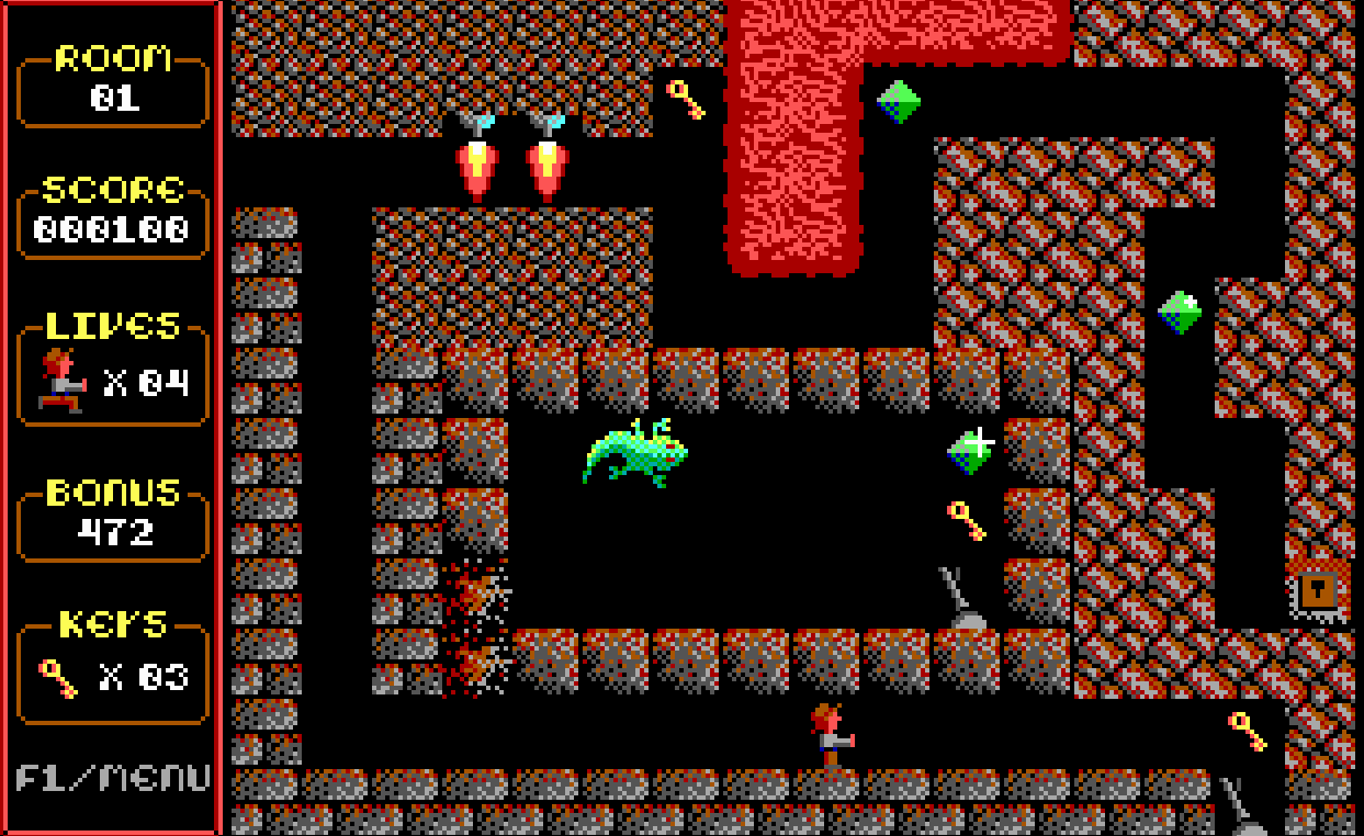 Paganitzu is a fun game, and it’s fun because it’s simple. It’s probably best described as an early example of a rouge-like. You are tasked with going from room to room in a dungeon, collecting keys necessary to unlock the door to each room as you progress. You can also collect gems found in each room for point bonuses.