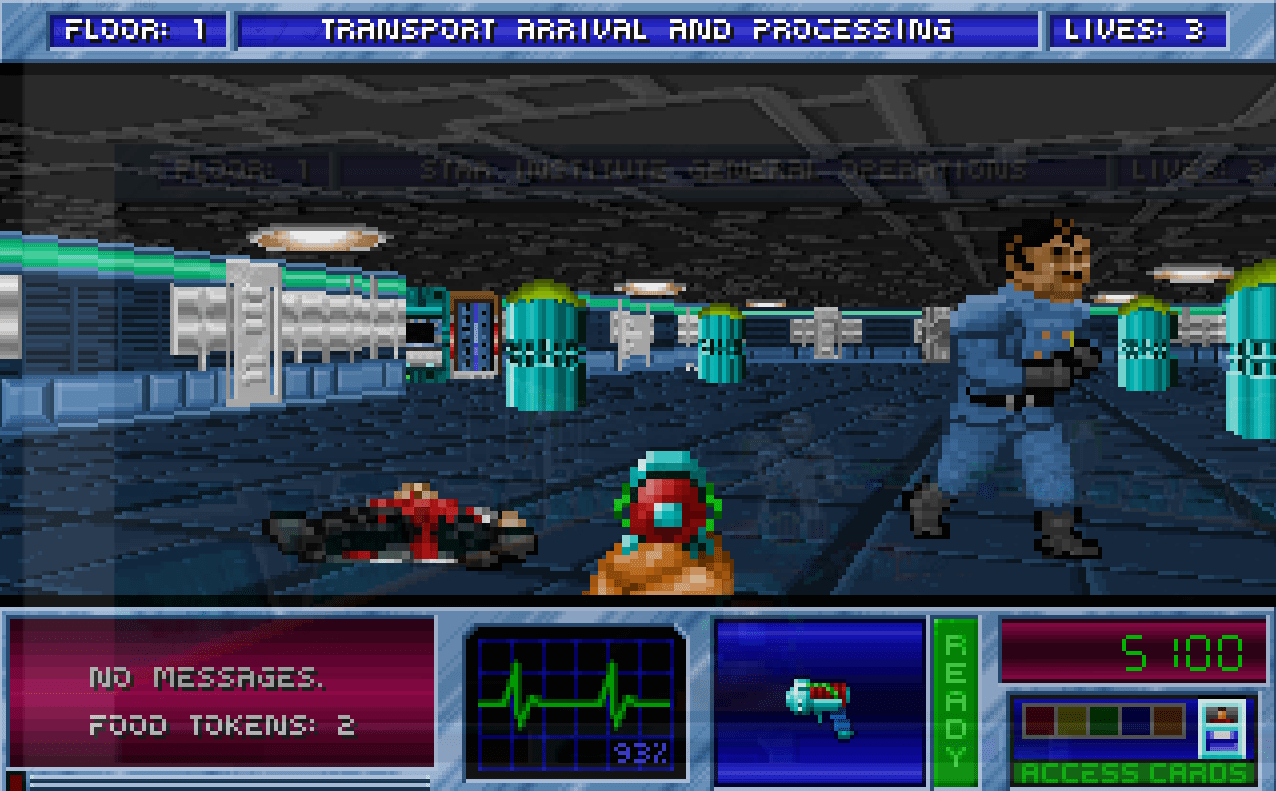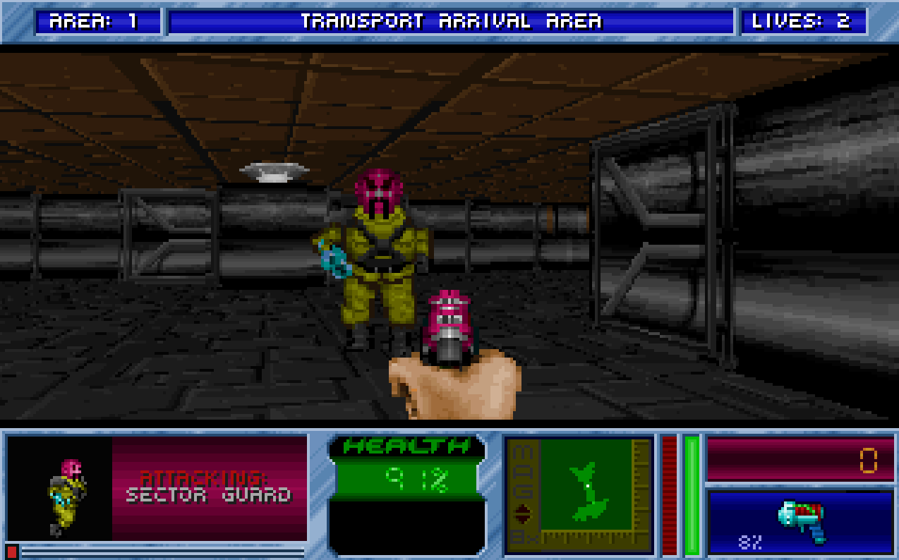 As typically found in this era, you don’t have any vertical movement for aiming, but instead move around blocky rooms shooting whatever is directly in front of you with a variety of weapons you’ll find along the way. To get through each level, you must find pass cards dropped by enemies to open new doors.