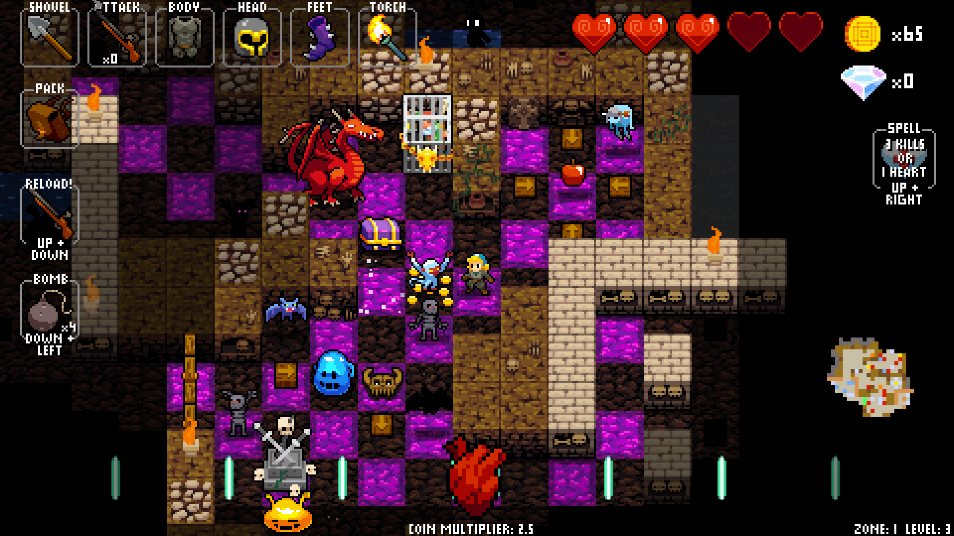 Game play requires you to move around the procedural-generated dungeons to the beat of the music. Attacking must also be in line with the beat, and defeating creatures yields gold and multipliers as long as you never break the rhythm. As you play you run into bigger and more dangerous enemies, as well as treasure chests that upgrade your attack power, defense, and visibility. There’s other loot to collect, like diamonds, that allow you to unlock more interesting upgrades in the game’s lobby, and must be spent between rounds. Upgrades don’t give you any enhancements at the start of your session, however. Instead they will show up in the chests you find in the crypt. The more you unlock, the better items you’ll find as you play. The gold you pick up from enemies allows you to buy some of those upgrades from shops found throughout the crypt, so some of that randomness can be overcome, if you wish.