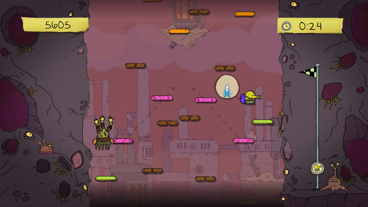 While the gameplay of Doodle Jump for Kinect is similar to its mobile counterpart, there are a few key differences. The first is that the goal is no longer to survive while jumping on an infinite amount of platforms. Levels now have a finite finish and it is up to players to make it to the end while racking up as many points as possible. Points can be achieved by collecting special coins, defeating enemies, and completing each level as fast as possible. There are thirty levels in all, but most of these levels are more or less the same with only three areas to play in (about 10 levels in each area).
