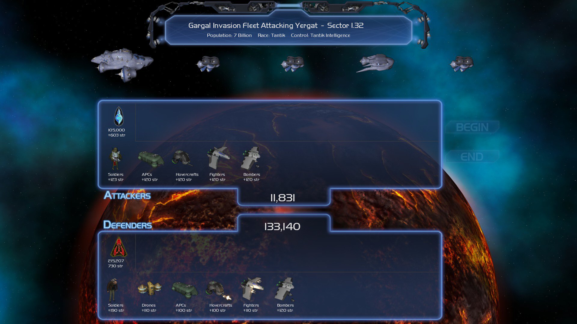 Now for the combat of Horizon. There are two ways in which you’ll engage in combat; one is obvious space battles with opposing fleets, the other an invasion, whether it’s your planet or another race’s planet. Invasions comes down to a basic numbers game. A screen will pop up to show yours and the enemy’s forces. It will show the total amount of troops available, what units are being used and the strength of each unit. After that it simply counts down until one side is zero, anti-climatic if you ask me. Unfortunately at this point not much strategy is involved. Just check to see how many soldiers are on the planet you’re invading and make sure you bring more, that’s it.