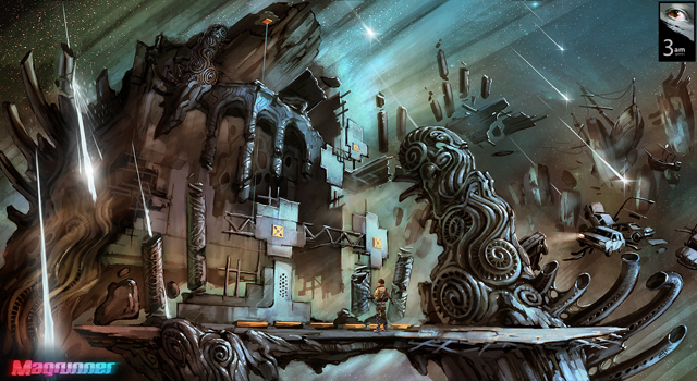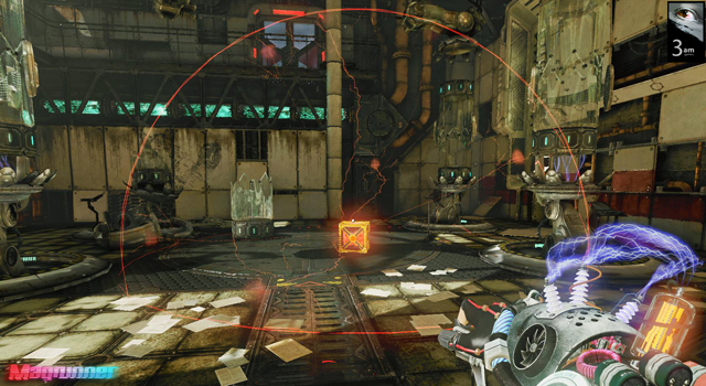3AM Games (an offshoot of Frogware, best known for their Sherlock Holmes adventure games) and Gamesplanet Lab (a new crowdfunding and digital distribution platform) have teamed up to bring us a Magrunner – Dark Pulse. My first peek at the videos and screenshots reminds me of both Portal (Valve cult hit gone viral) and Running Man (an 80’s Arnold Schwarzenegger movie.) The game starts off with the protagonist, named Yoshi, and his robotic dog Newton in the near future. They live in what 3AM are calling a cyberpunk society that holds something called the Gruckuzber Magrunner Challenge, which has people running through an obstacle/puzzle course with a gun that magnetizes objects to different polarities. This very Portal-esque competition starts out as a “friendly” (read: mutually profitable) corprorate competition, but quickly goes awry as beings from another dimension begin tearing through the fabric of space and time.