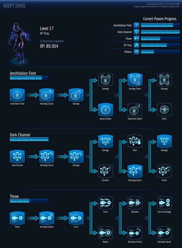 Mass Effect 3 features the most successful marriage of solid shooter and deep rpg mechanics and the multiplayer is no different. Every class has 3 powers plus character training and fitness. Just like in the campaign, every skill can be upgraded through six tiers. Tiers 4-6 are the most influential as each evolution option can drastically effect the attributes of each skill. While character training will effect weapon and power damage, fitness training will upgrade health, shields and melee damage. The level cap for each class is 20 and every level earned goes towards your N7 ranking. Once the level cap is reached, there is an option to promote the class to the war assets which resets all characters in the respective class.
