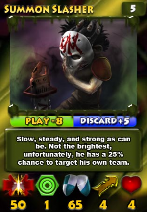 The basic gameplay is as follows. You have a deck of virtual cards that you have built for matches. During a match you will receive five of those cards at a time. Each one of the cards has a “Play” and “Discard” point value. When you discard a card you are then able to use those points towards summoning another.