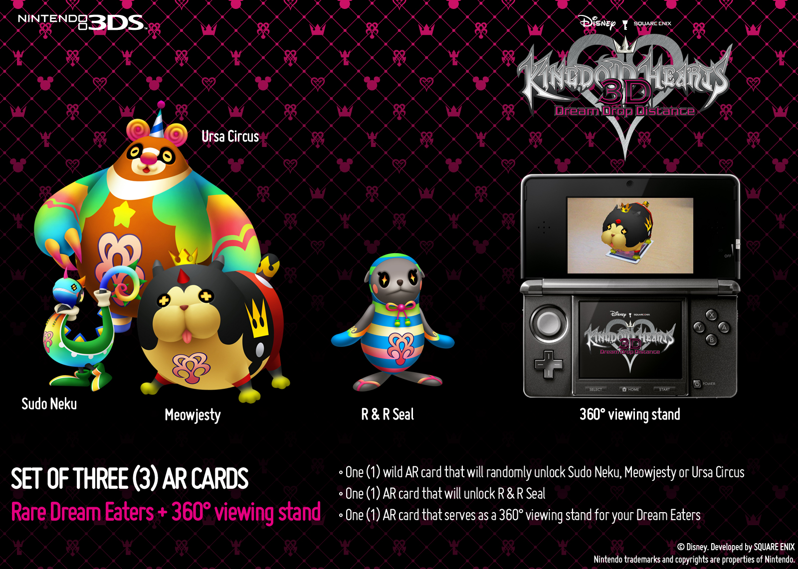 Square-Enix that gamers who pre-order Kingdom Hearts 3D: Dream Drop Distance will receive 3 augmented reality cards that will be used to unlock rare dream eaters and a 360 degree viewing stand. The wild card in the set will unlock one of the super rare dream eaters, players will unlock either Ursa Circus, Sudo Neku or Meowjesty. The 2nd card unlocks R&Rs seal dream eater and the third gives the viewing stand mentioned previously.