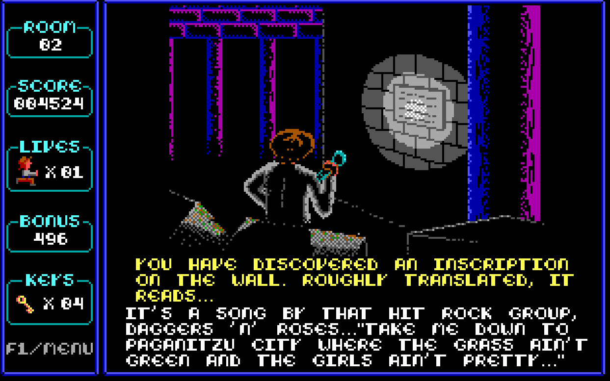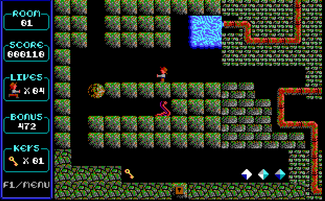 Paganitzu is a fun game, and it’s fun because it’s simple. It’s probably best described as an early example of a rouge-like. You are tasked with going from room to room in a dungeon, collecting keys necessary to unlock the door to each room as you progress. You can also collect gems found in each room for point bonuses.