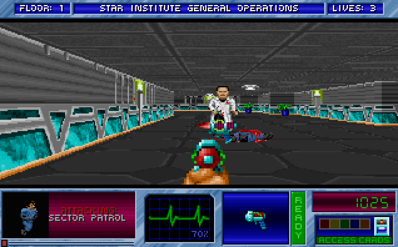 As typically found in this era, you don’t have any vertical movement for aiming, but instead move around blocky rooms shooting whatever is directly in front of you with a variety of weapons you’ll find along the way. To get through each level, you must find pass cards dropped by enemies to open new doors.