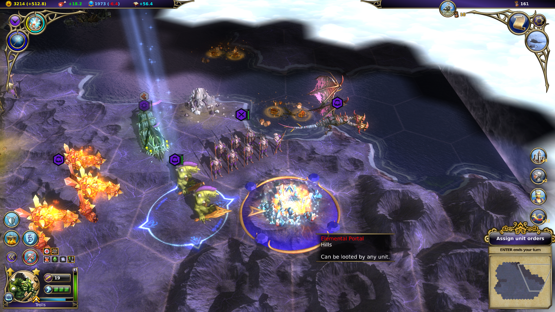 Unlike many 4X games, Warlock has a strong focus on environmental hazards, which can overwhelm you if you aren’t careful. Monster dens of various kinds spawn deadly creatures which will attack your cities. Left unchecked, these locations have the potential to overwhelm weaker settlements, and they pose a significant threat even late-game. (I could barely get my ships out of the port for most of the game, the seas were so choked with serpents and krakens.) Added to this is the existence of other planes, which can be accessed through portals and colonized. Assuming you’re able to overcome the tide of monsters on the other side…