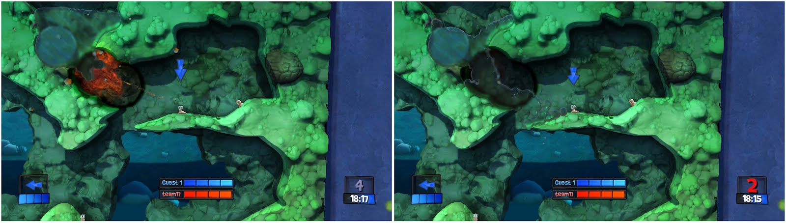 Spying a pool of water our worm decides to unleash its raw power, causing chaos to anyone below and a nice little escape route in the process.